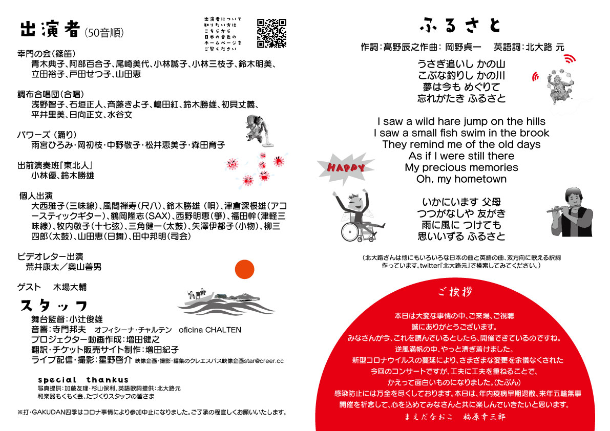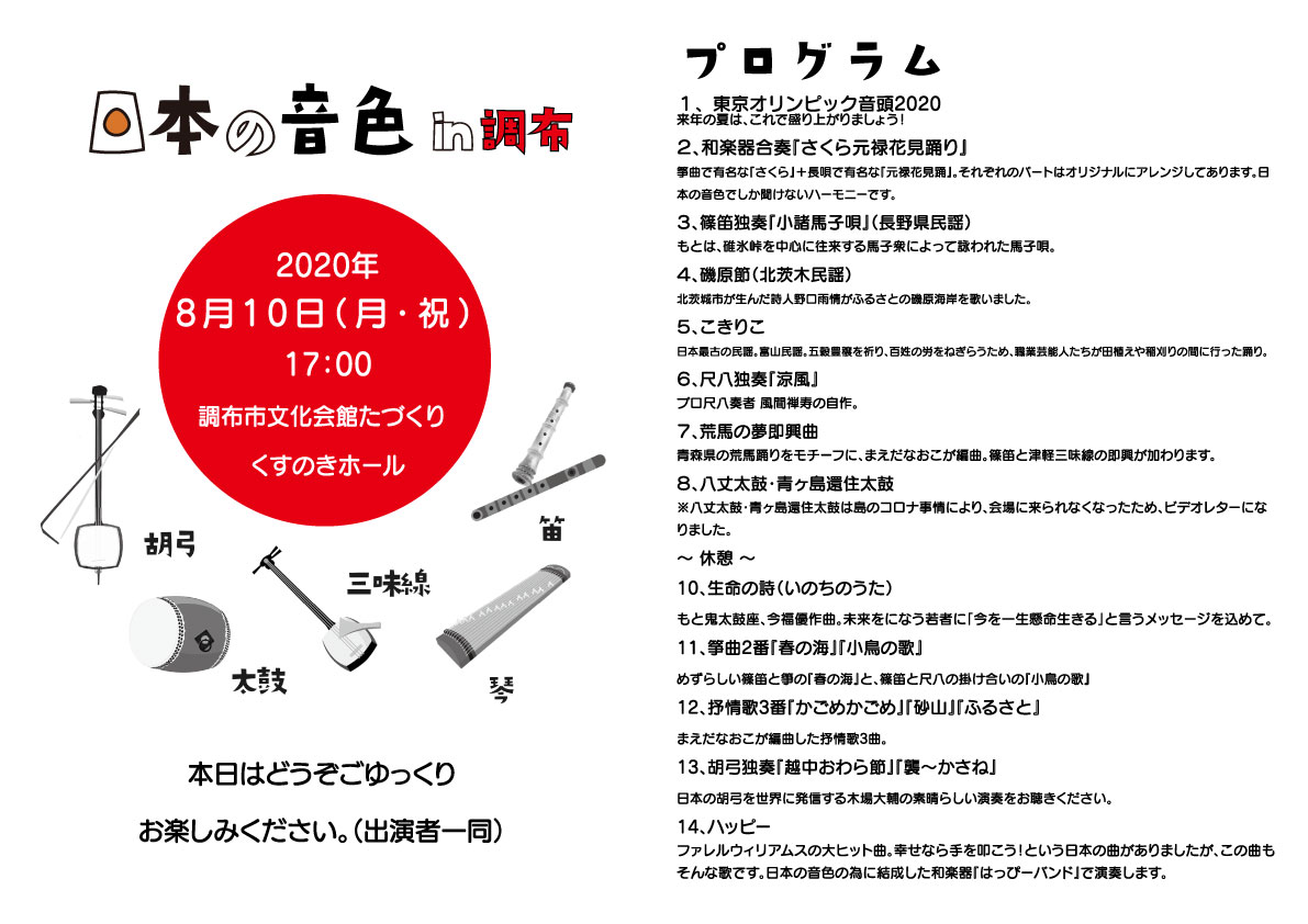 新進気鋭の芸大出身尺八プロ、風間さん、オーケストラと箏で何度も学生時代にセッションした箏の西野ちゃん、抜群の緩急をもつ太鼓せいら主催者、三角さん、ホールを満員にする団体を50年主催している鈴木さん、日舞の名取り、山田さん、箏の演奏からギターに楽器を変え、和洋融合の音楽家、ユッケさん、ライブ演奏で現代の津軽を追求する福田さん、東京和楽器社長の妹であり調布の大西楽器店オーナー大西さん、箏の先生でどこでもなんでも来いの17弦牧内さん、そして、現代のハンメルンで、道なき道を行く柳こと福原幸三郎。そして、こんな状況の中で参加してくれる幸門の会、調布狛江合唱団、出前演奏班『東北人』。