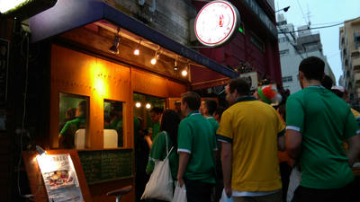 中心からちょっと離れた住宅街に近い道、いつもは地元民しか通っていない道に緑のユニフォームの列が!!。みんな、テイクアウトのお店に並んでビールを浴びるように飲んで、ひたすら盛り上がっている。試合前にもう出来上がっている。