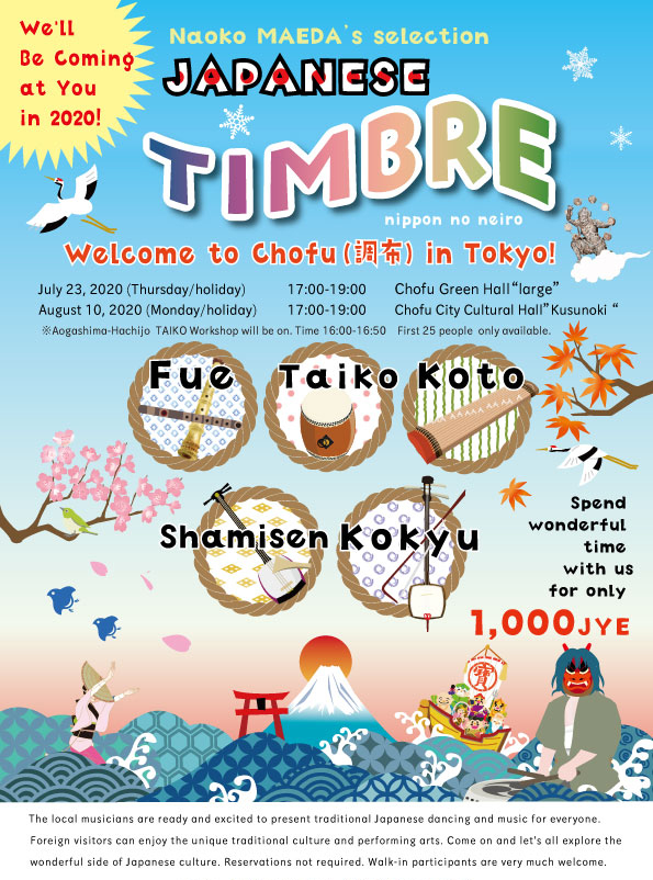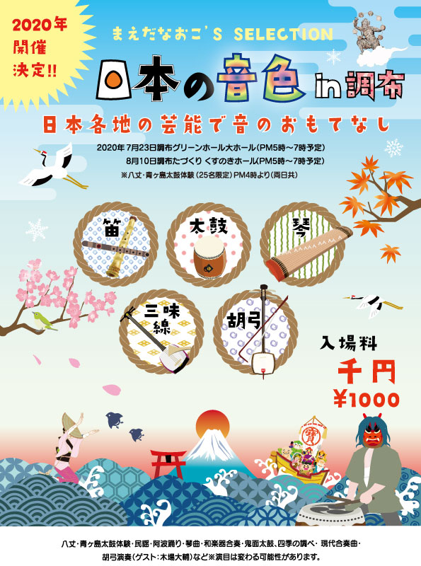 せいらの鬼面太鼓、雅楽多の阿波踊り、打・GAKUDAN四季の四季の調べで表現する四季、そして海をテーマにした芸能が多い(砂山、磯原節、炎陣(鬼面太鼓)、北海民謡、八丈・青ヶ島太鼓など)ことから、こんな絵になった。