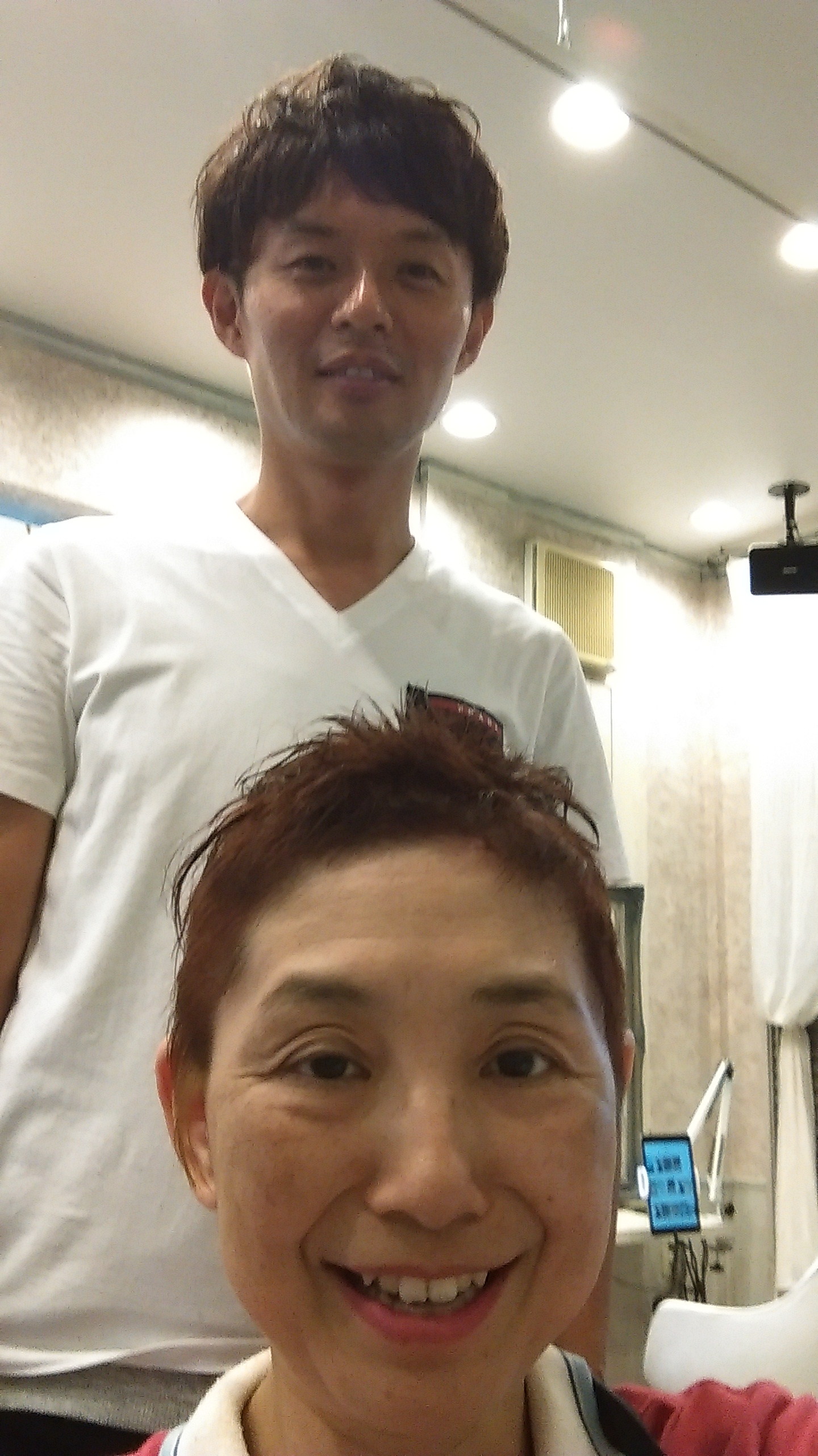 鏡にうつった店長と二人で記念撮影した -
