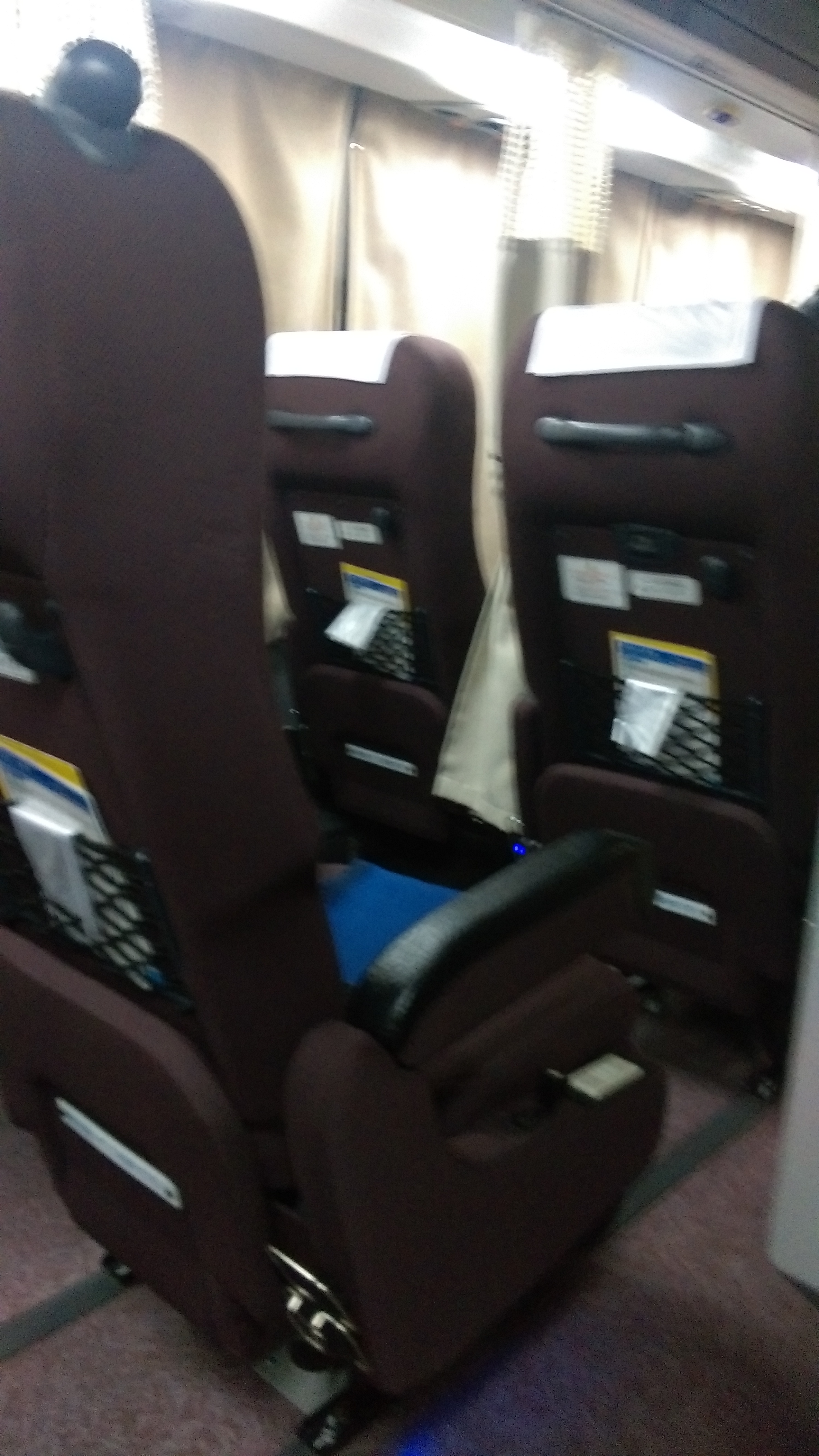 今回は前方3席は2列の個室になっていた。座席は黒いマッサージチェアみたいな椅子にグレードアップ。コンセントの代わりに差し込みがusbになっていて、手元明かりは二ヶ所になり、ピンポイントの範囲が鋭く小さく明るい。カーテンが、つながっておらず、個別にそれぞれ前方にぶら下がっている。