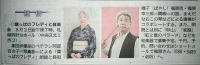 ドンと、ドンの笛の弟子、ドン主催の打・GAKUDAN四季のメンバー・ドンの息子てつ・そして俳優座現役女優YURIKOでおこなった、2019年8月2日「ここは、札幌時計台 はっぱのフレディ―音楽会」の顛末を話そう。